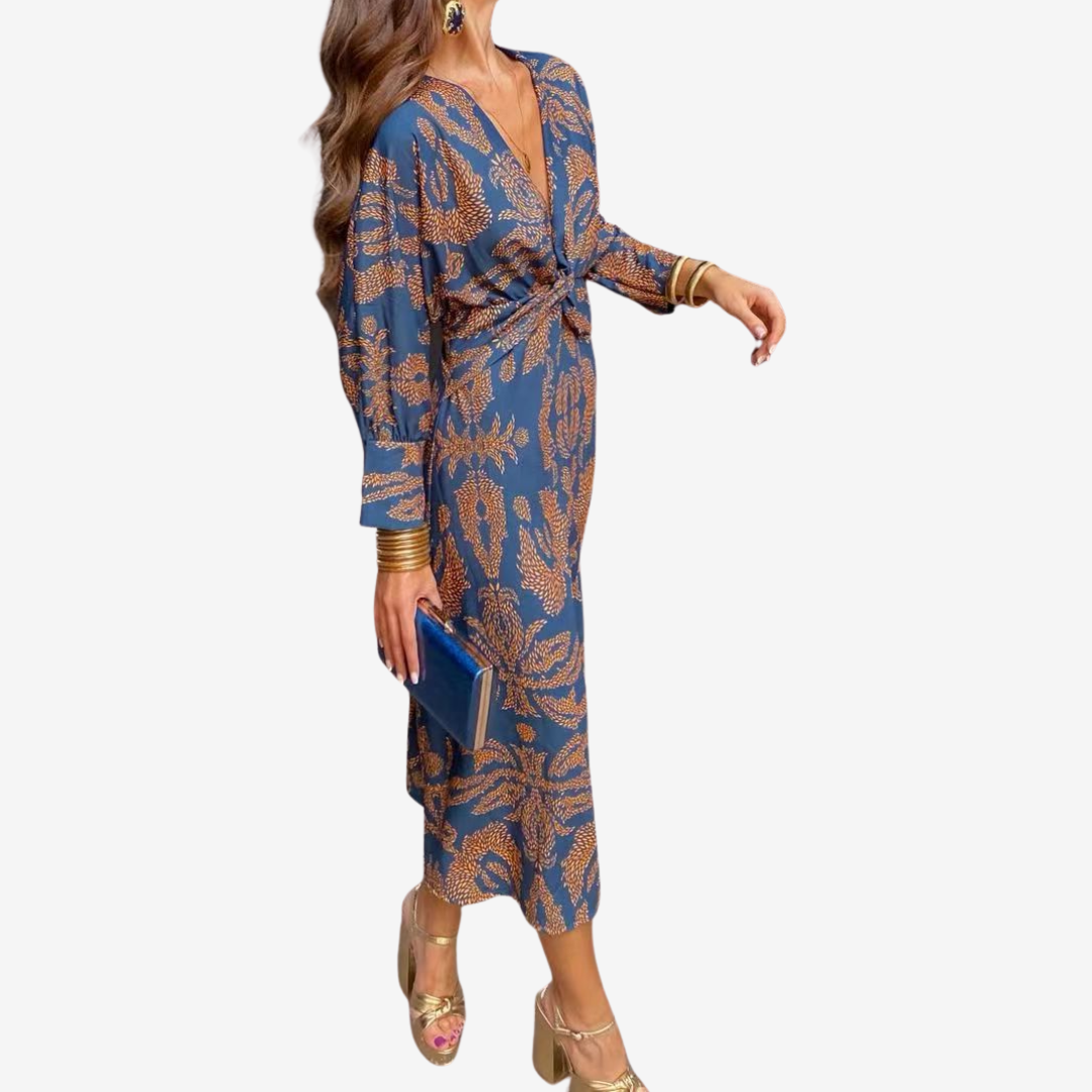 Doriane™ est une robe portefeuille midi sophistiquée, au drapé gracieux et à l'encolure en V flatteuse qui cintre la taille. Avec ses manches longues légèrement volumineuses et sa coupe élégante jusqu'aux mollets, elle épouse parfaitement la silhouette. Son imprimé cachemire complexe aux couleurs élégantes lui confère une touche bohème et raffinée, idéale en journée comme en soirée.
