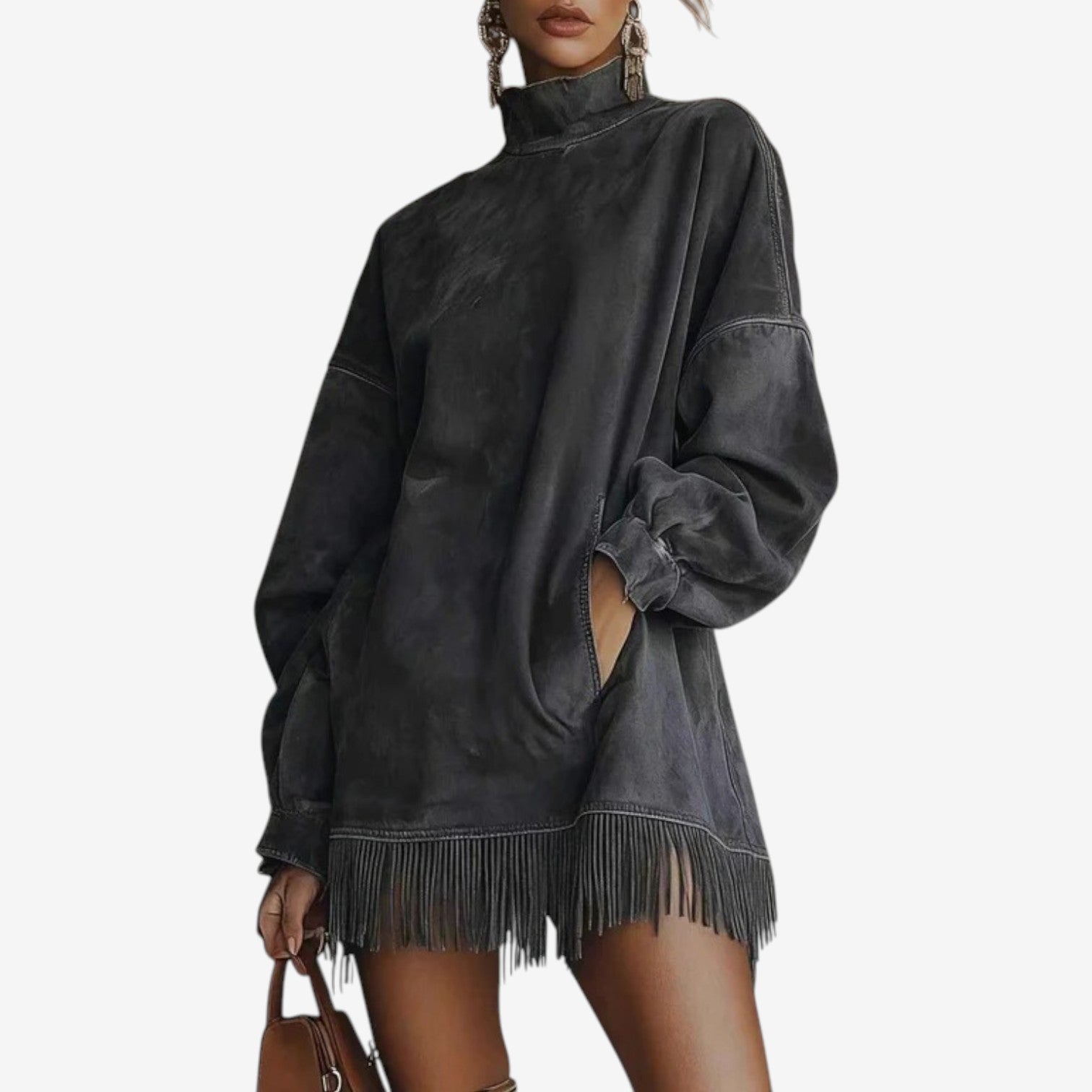 Une sophistication discrète se dégage de sa texture douce, semblable à du daim, et de sa silhouette fluide et drapée. Le col montant et les manches longues créent un cocon de structure délicate, tandis que l'ourlet à franges apporte une touche de mouvement. Ses tons naturels évoquent une élégance raffinée et intemporelle. Portée en toute saison, elle s'adapte avec aisance aux superpositions ou se suffit à elle-même.